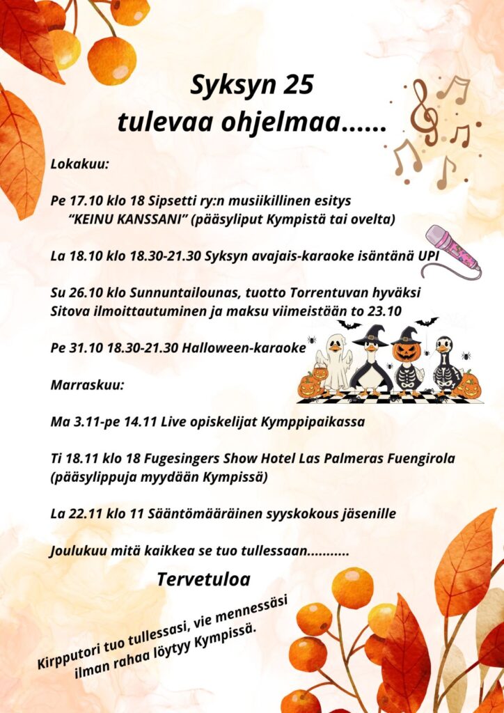 - Toiminnastamme ja tapahtumistamme voit lukea nettisivuiltamme, facebookista sekä Kympin ilmoitustaululta.